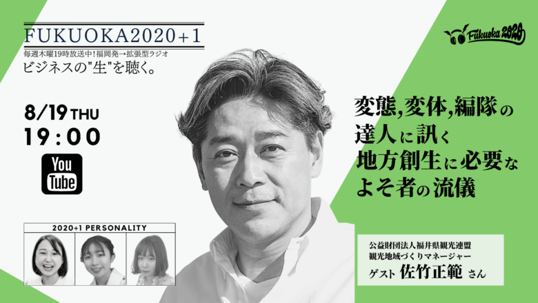 NPO法人学生ネットワークWANが、ビシップ株式会社と共同でお送りしているFMラジオ「FUKUOKA2020」。 今回のゲストは‥ 8/19(木)、第151回目の放送は、公益財団法人福井県観光連盟 観光地域づくりマネージャー 佐竹正範さんと大学生パーソナリティ、りよ、あんな、ななみが対談しました。 テーマは、『【地方創生】人に愛され巻き込む発信とまちを舞台にしたキャリア構築 』。 配信はこちらからご覧いただけます。 FUKUOKA2020とは? 毎週木曜日19時から生配信!〜ビジネスのR