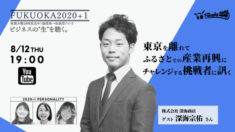 NPO法人学生ネットワークWANが、ビシップ株式会社と共同でお送りしているFMラジオ「FUKUOKA2020」。 今回のゲストは‥ 8/12(木)、第150回目の放送は、株式会社深海商店 深海宗佑さんと大学生パーソナリティ、もね、みゆ、りよが対談しました。 FUKUOKA2020とは? 毎週木曜日19時から生配信!〜ビジネスの”生”を伝える拡張型ラジオ FUKUOKA2020〜FUKUOKA2020 は、「ビジネス」「地方創生」「シェアリングエコノミー」「DX」をキーワ