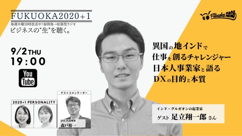 NPO法人学生ネットワークWANが、ビシップ株式会社と共同でお送りしているFMラジオ「FUKUOKA2020」。 今回のゲストは‥ 9/2(木)、第153回目の放送は、インド・グルガオンの起業家 足立翔一郎さんと大学生パーソナリティ、りよ、きほ、ゲストコメンテーター JDX代表理事 森戸裕一が対談しました。 テーマは、『 異文化の地インドで仕事を創るチャレンジャー日本人事業家と語るDXの目的と本質 』。 配信の様子はこちらからご覧いただけます。 FUKUOKA2020とは? 毎週木曜日19時か