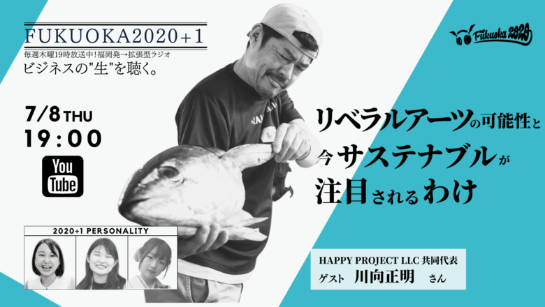 NPO法人学生ネットワークWANが、ビシップ株式会社と共同でお送りしているFMラジオ「FUKUOKA2020」。 今回のゲストは‥ 7/8(木)、第145回目の放送は、HAPPY PROJECT LLC共同代表 川向正明さんと大学生パーソナリティ、もね、きみこ、りよが対談しました。 テーマは、『リベラルアーツの可能性と今サステナブルが注目されるわけ』。 配信の様子はこちらからご覧いただけます。 FUKUOKA2020とは? 毎週木曜日19時から生配信!〜ビジネスの”生”