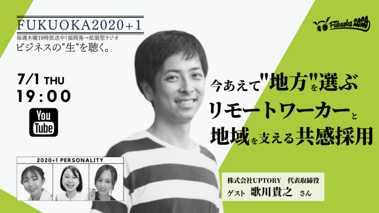 NPO法人学生ネットワークWANが、ビシップ株式会社と共同でお送りしているFMラジオ「FUKUOKA2020」。 今回のゲストは‥ 7/1(木)、第144回目の放送は、株式会社 歌川貴之さんと大学生パーソナリティ、あんな、りよ、もえが対談しました。 テーマは、『 今あえて”地方”を選ぶ リモートワーカーと地域を支える共感採用』。 配信の様子はこちらからご覧いただけます。 FUKUOKA2020とは? 毎週木曜日19時から生配信!〜ビジネスの”生”を伝える拡張型ラジオ F