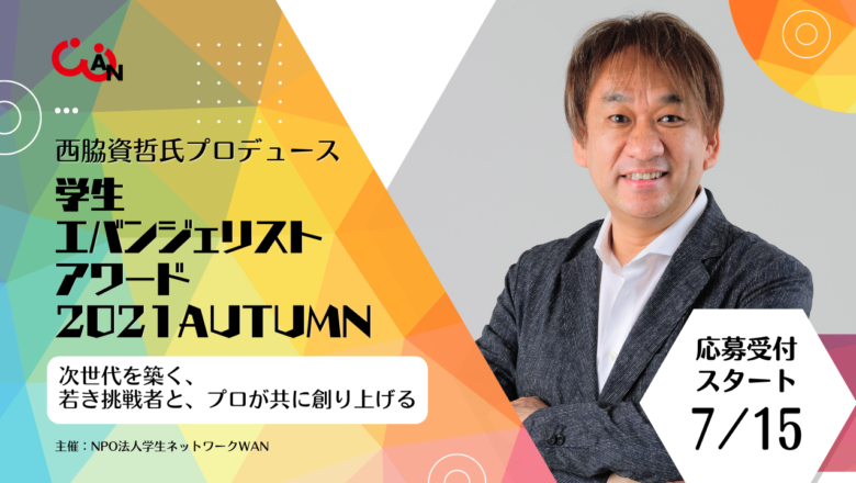 次世代を担う人材育成や地域の情報発信支援を手がけるNPO法人学生ネットワークWANは、2021年7月15日(木)より、全国各地の次世代リーダーを発掘し、彼ら自身の活動を加速させる「学生エバンジェリストアワード 2021 Autumn」を開催いたします。 全国各地の次世代リーダーを発掘し、彼ら自身の活動を加速させる「学生エバンジェリストアワード 2021 Autumn」の開催が、2021年7月15日(木)の応募受付開始とともにスタートします。 本プロジェクトは、次世代を担う人材育成や地域の情報発信