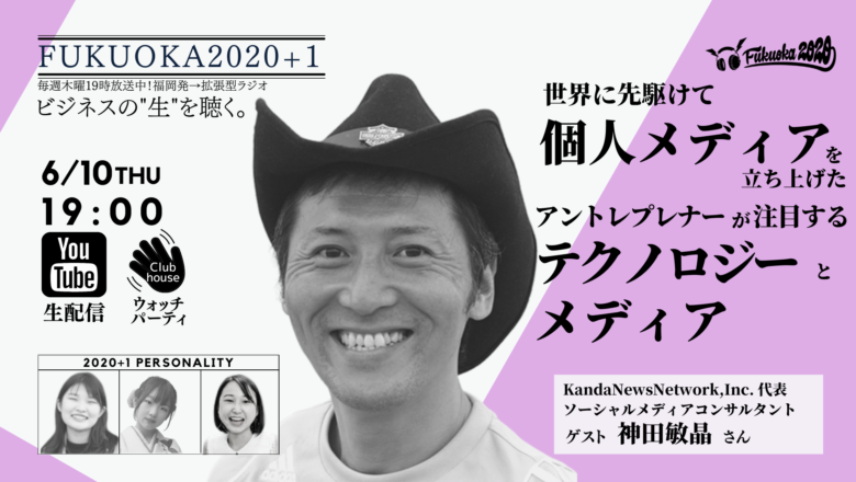NPO法人学生ネットワークWANが、ビシップ株式会社と共同でお送りしているFMラジオ「FUKUOKA2020」。 今回のゲストは‥ 6/10(木)、第141回目の放送は、株式会社 神田敏晶さんと大学生パーソナリティ、もね、きみこ、りよが対談しました。 テーマは、『世界に先駆けて個人メディアを立ち上げたアントレプレナーが注目するテクノロジーとメディア 』。 配信の様子はこちらからご覧いただけます。 FUKUOKA2020とは? 毎週木曜日19時から生配信!〜ビジネスの”生”