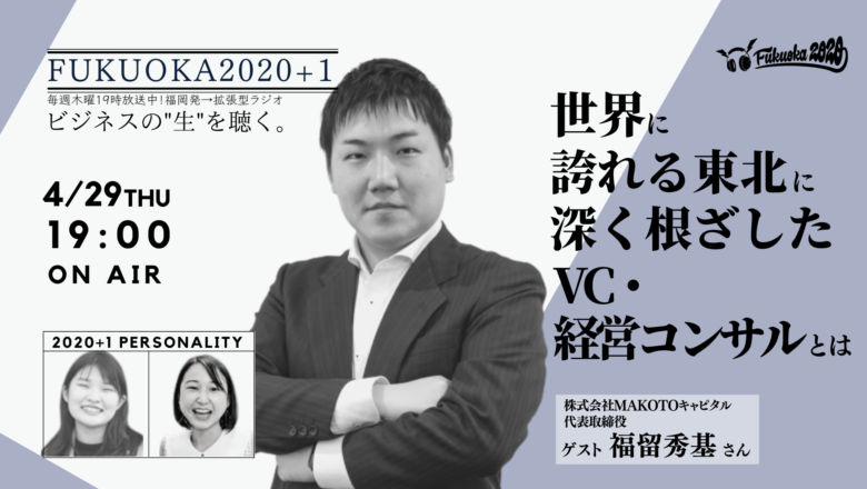 NPO法人学生ネットワークWANが、ビシップ株式会社と共同でお送りしているFMラジオ「FUKUOKA2020」。 今回のゲストは‥ 4/29(木)、第135回目の放送は、株式会社MAKOTOキャピタル 代表取締役 福留秀基さんと大学生パーソナリティ、もね、りよ が対談しました。 テーマは、『 世界に誇れる東北を地域に根ざす経営コンサル・VCのあり方とは 』。 配信の様子はこちらからご覧いただけます。 FUKUOKA2020とは? 毎週木曜日19時から生配信!〜ビジネスの”生R