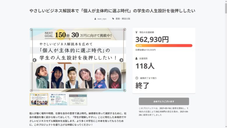 【お礼とご報告】 100名を超える皆様に応援いただいた、こちらのクラウドファンディング、4/28(水)23:59をもちまして終了いたしました! 【結果発表】 ご支援総額 362,930円 ご支援者数 118人 目標達成率 362% こんなにもたくさんの方に応援していただき、本当に嬉しく思います!心より御礼申しあげます。 書籍の出版につきましては、5月末を予定しております! リターン品に関する進捗は、また別途ご報告させていただきます。まずは、ここまで皆様のお力でこのプロジェクトを盛り上げてくださり