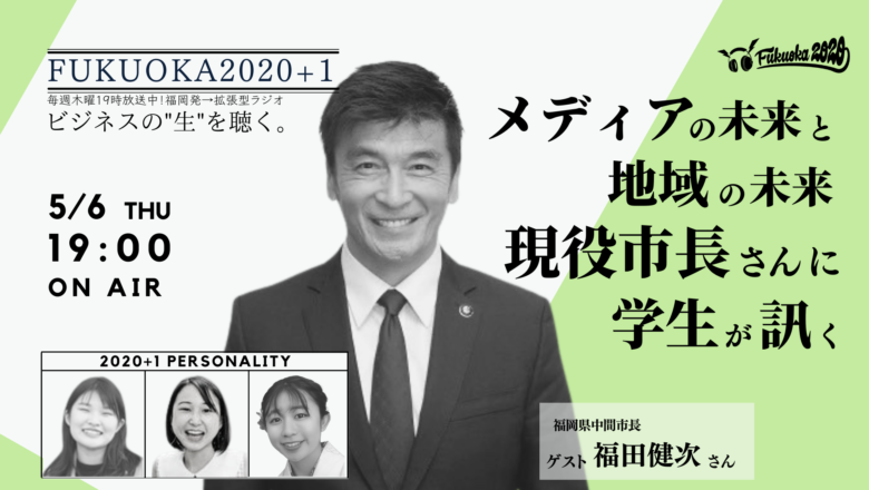 NPO法人学生ネットワークWANが、ビシップ株式会社と共同でお送りしているFMラジオ「FUKUOKA2020」。 今回のゲストは‥ 5/6(木)、第136回目の放送は、福岡県中間市長 福田健次さんと大学生パーソナリティ、りよ、もね、あんな が対談しました。 テーマは、『 メディアの未来と地域の未来、現役市長さんに学生が訊く 』。 配信の様子はこちらからご覧いただけます。 FUKUOKA2020とは? 毎週木曜日19時から生配信!〜ビジネスの”生”を伝える拡張型ラジオ F