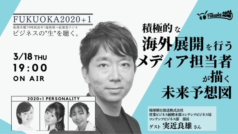 NPO法人学生ネットワークWANが、ビシップ株式会社と共同でお送りしているFMラジオ「FUKUOKA2020」。 今回のゲストは‥ 3/18(木)、第129回目の放送は、琉球朝日放送株式会社 営業ビジネス統轄本部 コンテンツビジネス局コンテンツビジネス部 部長 実近良雄さんと大学生パーソナリティ、かな、みなみ、あんなが対談しました。 テーマは、『積極的な海外展開を行うメディア担当者が描く未来予想図』。 配信の様子はこちらからご覧いただけます。 FUKUOKA2020とは? 毎週木曜日19時から