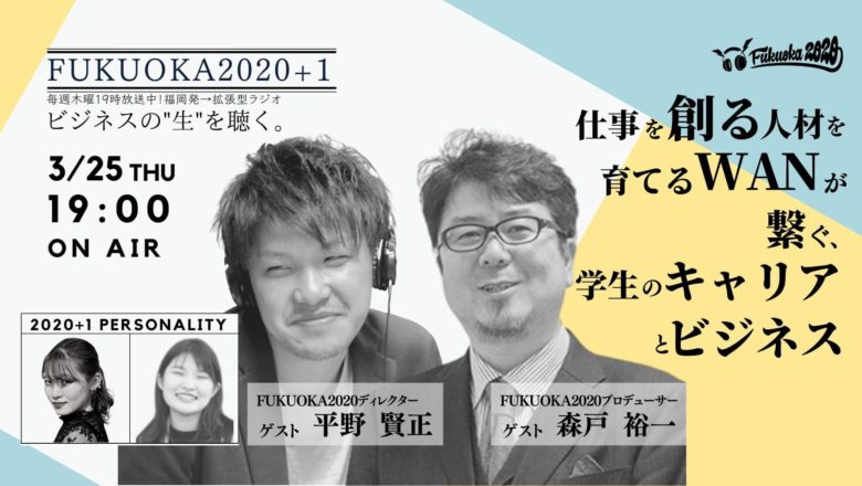 NPO法人学生ネットワークWANが、ビシップ株式会社と共同でお送りしているFMラジオ「FUKUOKA2020」。 今回は‥ 3/25(木)、第130回目の放送は、FUKUOKA2020プロデューサー 森戸裕一とFUKUOKA2020 ディレクター 平野賢正が、大学生パーソナリティ、すなお、もねが対談しました。 テーマは、『仕事を創る人材を育てるWANが繋ぐキャリアとビジネス 』。 放送内容はアーカイブ記事でもご紹介しています。 配信の様子はこちらからご覧いただけます。 FUKUOKA2020と