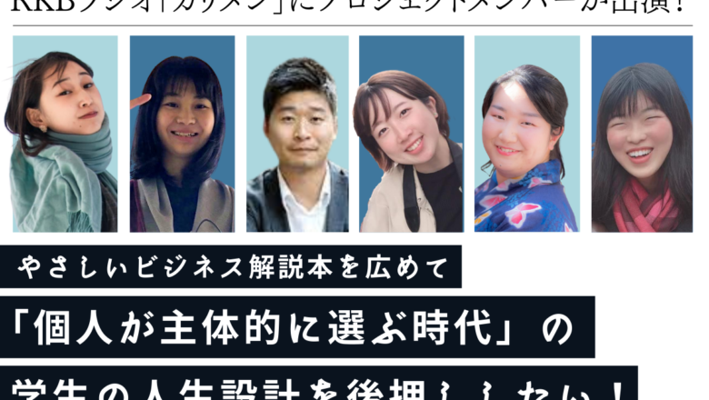 3/25(木)21時〜放送の、RKBラジオ「カリメン」に、当法人のメンバー2名が出演いたします。 出演する2名は、3/16(火)より開始したクラウドファンディング「やさしいビジネス解説本で「個人が主体的に選ぶ時代」の学生の人生設計を後押ししたい」のプロジェクトメンバーです。 このクラウドファンディングは、3年前より製作を開始したプロジェクトの集大成で、ビジネスに馴染みがない学生に、仕事選びやキャリアデザインをする上でのひとつの軸としてビジネスに関する知識を身に着けてもらうことを目的に、「やさしく