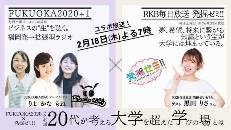 NPO法人学生ネットワークWANが、ビシップ株式会社と共同で毎週木曜日の19:00からお送りしている次世代ラジオ「FUKUOKA2020」。 2021年2月18日(木)第125回の放送(19:00-20:00)は、RKB毎日放送「発掘ゼミ!!」とのコラボでお届けします。 「発掘ゼミ!!」は、飽くなき探究心と無限の好奇心を胸に秘め、未来へ続く「可能性」を探求し続ける学生や研究者を発掘する番組です。 2/18㈭の放送では、FUKUOKA2020という「拡張型ラジオ」を運営する女子大生パーソナリティが