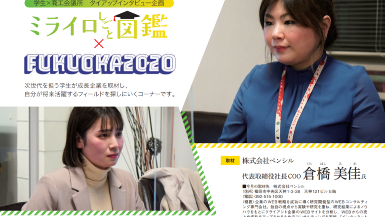 NPO法人学生ネットワークWAN(以下、WAN)と福岡商工会議所のコラボ企画である「ミライロ仕事図鑑 2月号」が公開されました。 今月の取材先は、株式会社ペンシルの倉橋美佳さんです。 ミライロ仕事図鑑は、WANと福岡商工会議所のコラボ企画で、毎月発刊される福岡商工会議所ニュースのコーナーです。 次世代を担う学生がミライロ仕事図鑑を通じて成長企業を取材し、自分が将来活躍するフィールドを探しにいきます。 PDF版 https://www.fukunet.or.jp/wp-content/upload