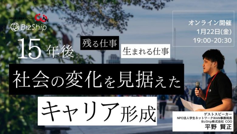 2021年1月22日(金)、「【学生限定】15年後に残るしごと、生まれるしごと 〜社会の変化を見据えたキャリア形成」をBizShip株式会社と共同で開催いたしました。 イベントの詳細はこちらからご覧いただけます。