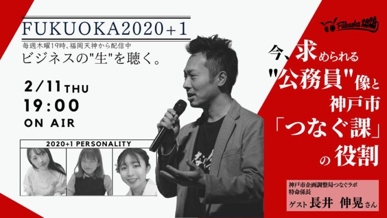 NPO法人学生ネットワークWANが、ビシップ株式会社と共同でお送りしているFMラジオ「FUKUOKA2020」。 今回のゲストは‥ 2/11(木)、第124回目の放送は、神戸市企画調整局つなぐラボ 特命係長 長井伸晃さんと大学生パーソナリティ、えりか、たまき、あんなが対談しました。 テーマは、『今求められる“公務員”像と、神戸市「つなぐ課」の役割』。 配信の様子はこちらからご覧いただけます。 FUKUOKA2020とは? 毎週木曜日19時から生配信!〜ビジネスの”生