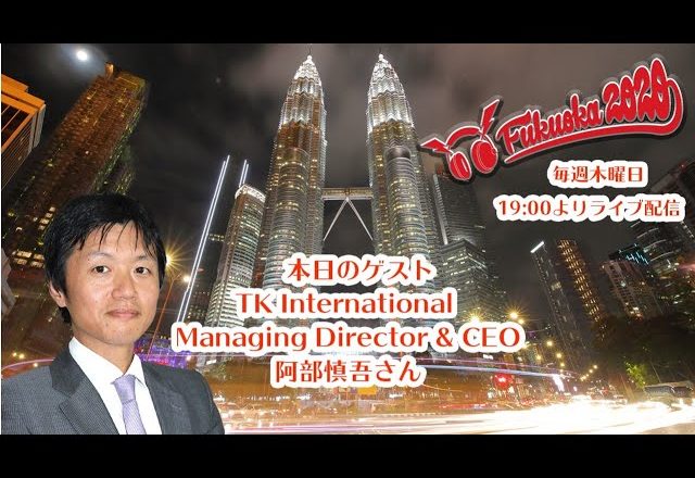 NPO法人学生ネットワークWANが、ビシップ株式会社と共同でお送りしているFMラジオ「FUKUOKA2020」。 今回のゲストは‥ 12/3(木)、第114回目の放送は、TK International Sdn Bhd CEO 阿部慎吾さんと、FUKUOKA2020ディレクター平野と、大学生パーソナリティ、たまきが対談しました。 配信の様子はこちらからご覧いただけます。 FUKUOKA2020とは? 毎週木曜日19時から生配信!〜ビジネスの”生”を伝える拡張型ラジオ F