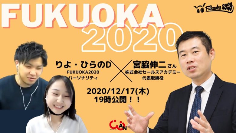 NPO法人学生ネットワークWANが、ビシップ株式会社と共同でお送りしているFMラジオ「FUKUOKA2020」。 今回のゲストは‥ 12/17(木)、第116回目の放送は、株式会社セールスアカデミー 代表取締役 宮脇伸二さんと、FUKUOKA2020ディレクター平野と大学生パーソナリティ、りよ、かなが対談しました。 配信の様子はこちらからご覧いただけます。 FUKUOKA2020とは? 毎週木曜日19時から生配信!〜ビジネスの”生”を伝える拡張型ラジオ FUKUOKA2