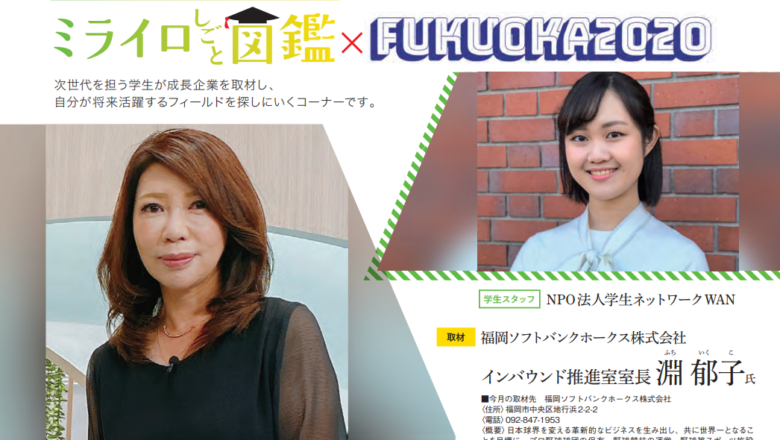 NPO法人学生ネットワークWAN(以下、WAN)と福岡商工会議所のコラボ企画である「ミライロ仕事図鑑 12月号」が公開されました。 今月の取材先は、福岡ソフトバンクホークス株式会社の淵郁子さんです。 ミライロ仕事図鑑は、WANと福岡商工会議所のコラボ企画で、毎月発刊される福岡商工会議所ニュースのコーナーです。 次世代を担う学生がミライロ仕事図鑑を通じて成長企業を取材し、自分が将来活躍するフィールドを探しにいきます。 PDF版 NEWS202012_mirairo.pdf (fukunet.or.