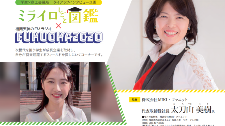NPO法人学生ネットワークWAN(以下、WAN)と福岡商工会議所のコラボ企画である「ミライロ仕事図鑑 9月号」が公開されました。 今月の取材先は、株式会社MIKI・ファニットの太刀山美樹さんです。 ミライロ仕事図鑑は、WANと福岡商工会議所のコラボ企画で、毎月発刊される福岡商工会議所ニュースのコーナーです。 次世代を担う学生がミライロ仕事図鑑を通じて成長企業を取材し、自分が将来活躍するフィールドを探しにいきます。 PDF版 NEWS202009_mirairo.pdf (fukunet.or.j