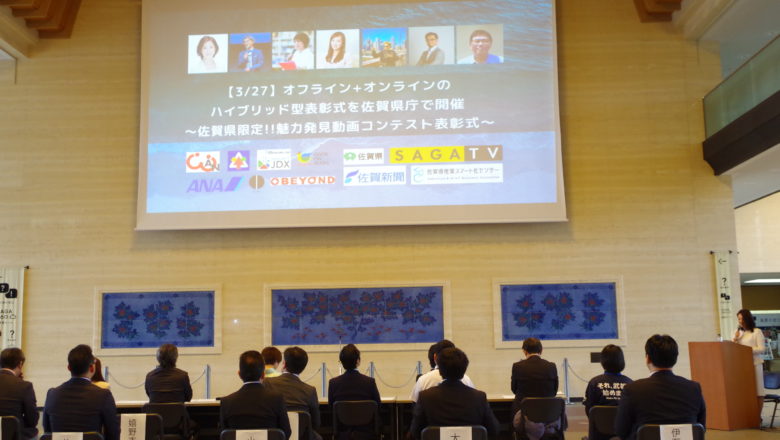 NHK(2020年3月27日放送)にて、2020年3月27日に佐賀県庁で開催した、「佐賀県限定!! 魅力発見動画コンテスト」の「オフライン+オンラインのハイブリッド型表彰式」の模様をご紹介いただきました。 コンテストの受賞作品一覧はこちら 本表彰式は、新型コロナウイルスへの対策として、関係者のみの少人数で開催し、会場の様子はYou Tubeでライブ配信をしました。また、Web会議ツール「Zoom」を活用した審査員のオンライン参加など、オンラインとオフラインを組み合わせた、ハイブリットな表彰式とし