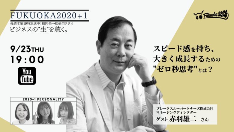 NPO法人学生ネットワークWANが、ビシップ株式会社と共同でお送りしているFMラジオ「FUKUOKA2020」。 今回のゲストは‥ 9/23(木)、第156回目の放送は、ブレークスルーパートナーズ株式会社マネージングディレクター 赤羽雄二さんと大学生パーソナリティ、りよ、まな、ななみが対談しました。 テーマは、『 スピード感を持ち、大きく成長するための”ゼロ秒思考”とは? 』。 配信の様子はこちらからご覧いただけます。 FUKUOKA2020とは? 毎週木曜日19時から生配信!〜ビジネスの&#